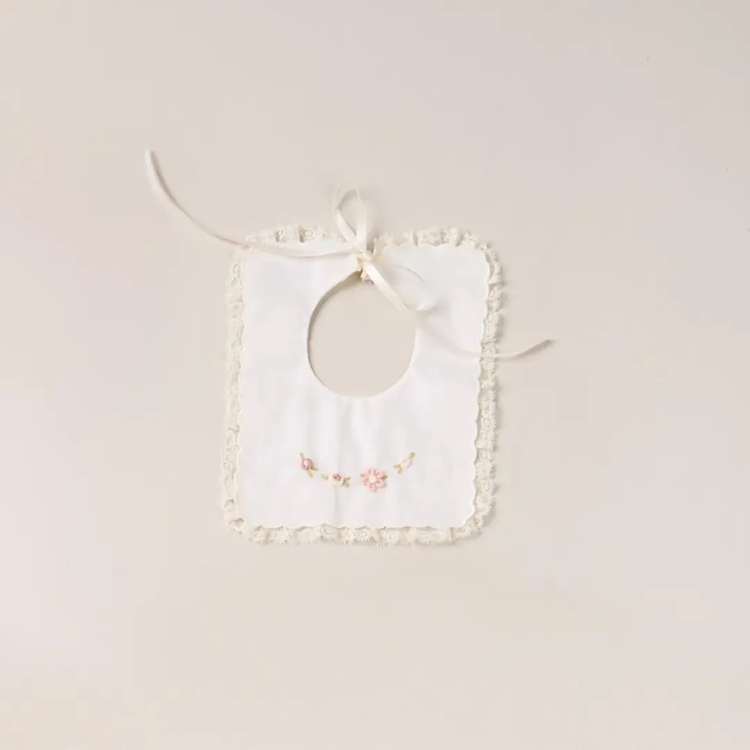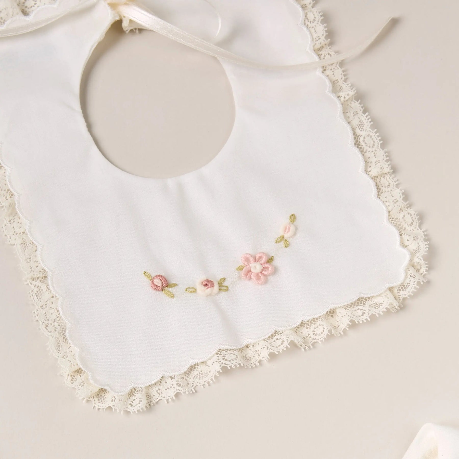 Exquisite baby girls bib in white with delicate 'little roses' detail. The Piccola Rosa bib is lovingly designed and handmade in Sicily using the finest materials.