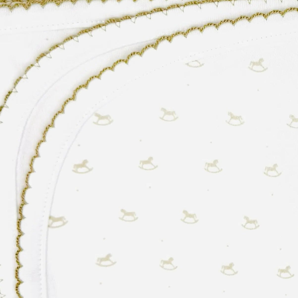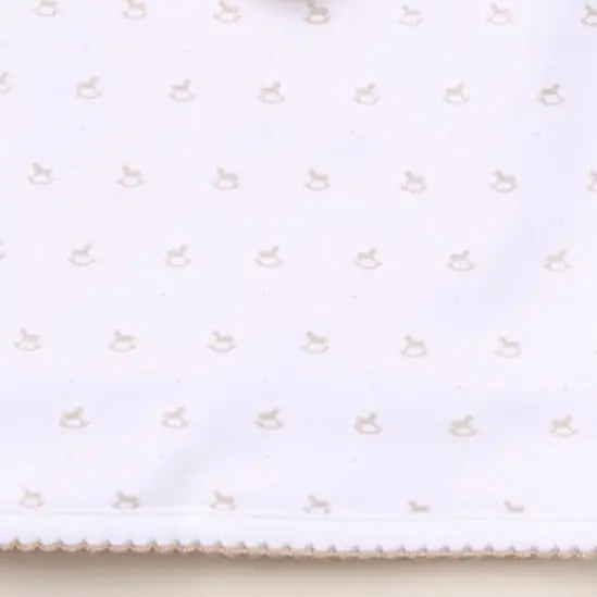 Wrap your little one in cosy charm with this delightful baby blanket, featuring an exclusive Blue Almonds rocking horse print in soft beige. Crafted from premium Pima cotton, it’s silky smooth and gentle on delicate newborn skin. The neutral beige shade with matching trim makes it perfect for both boys and girls, adding a touch of whimsy and warmth to nap time or cuddles.