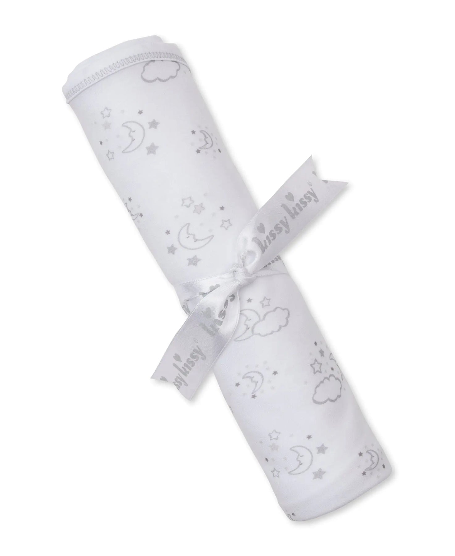 Wrap your little star in this soft white Pima cotton baby blanket, perfect for both boys and girls. Featuring a charming grey night-sky print, it adds a cosy and playful touch to nap time or bedtime. Made by Kissy Kissy, this blanket pairs wonderfully with matching items for a complete, dreamy set.