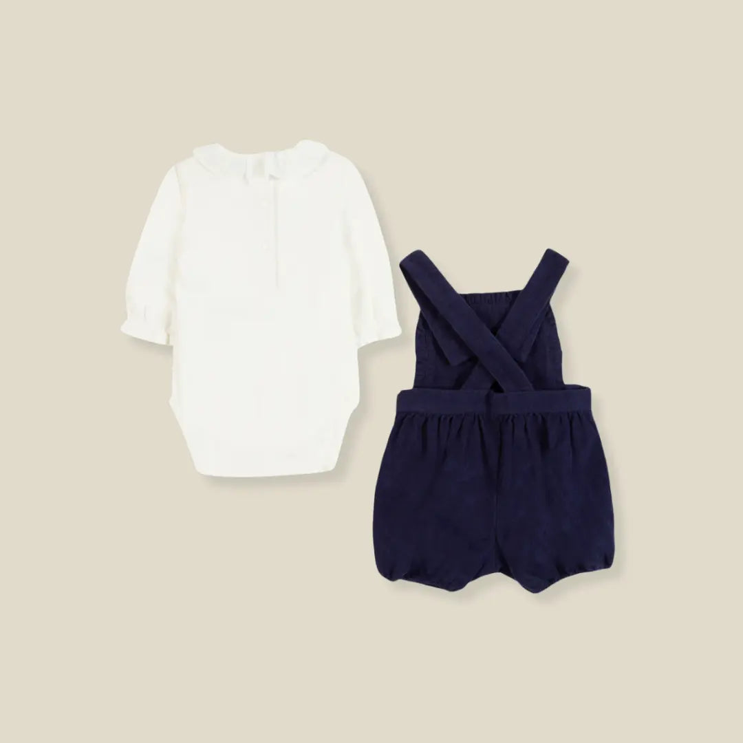 Dress your little one in this charming autumn-ready outfit featuring dark blue jewel-toned short dungarees paired with a crisp white long-sleeved top. The top’s ruffled collar, adorned with delicate embroidery, adds a sweet, playful touch. Complete the look with tights (sold separately) to keep her cosy and stylish through the cooler months.