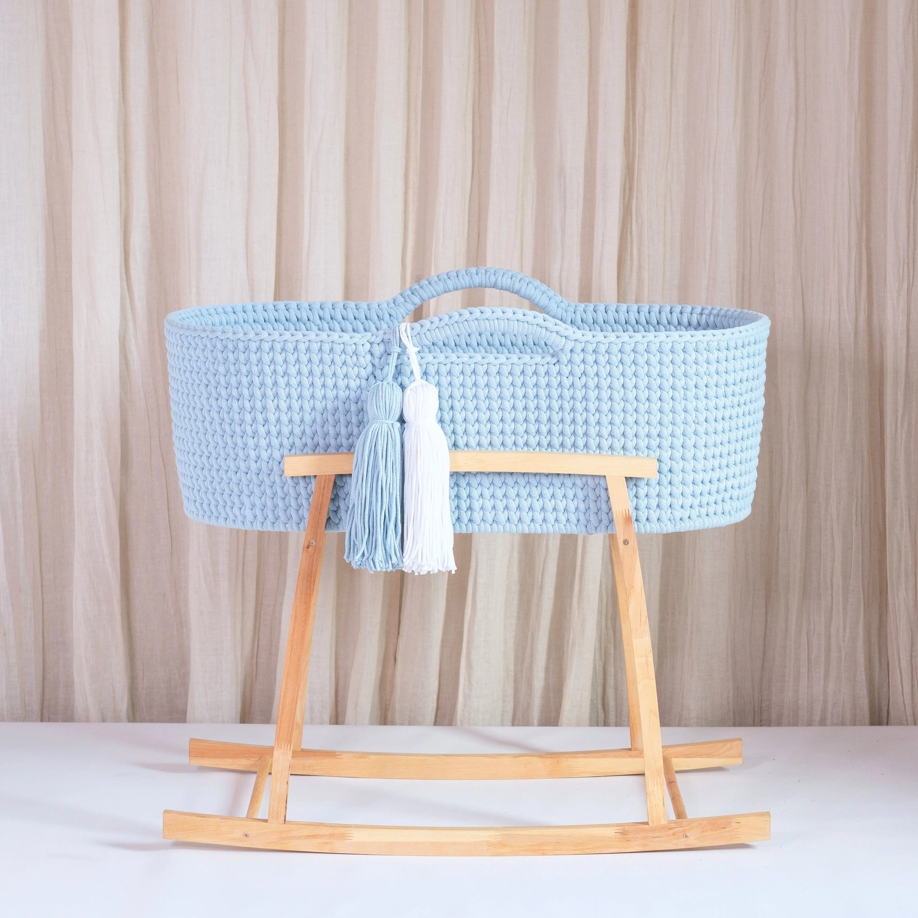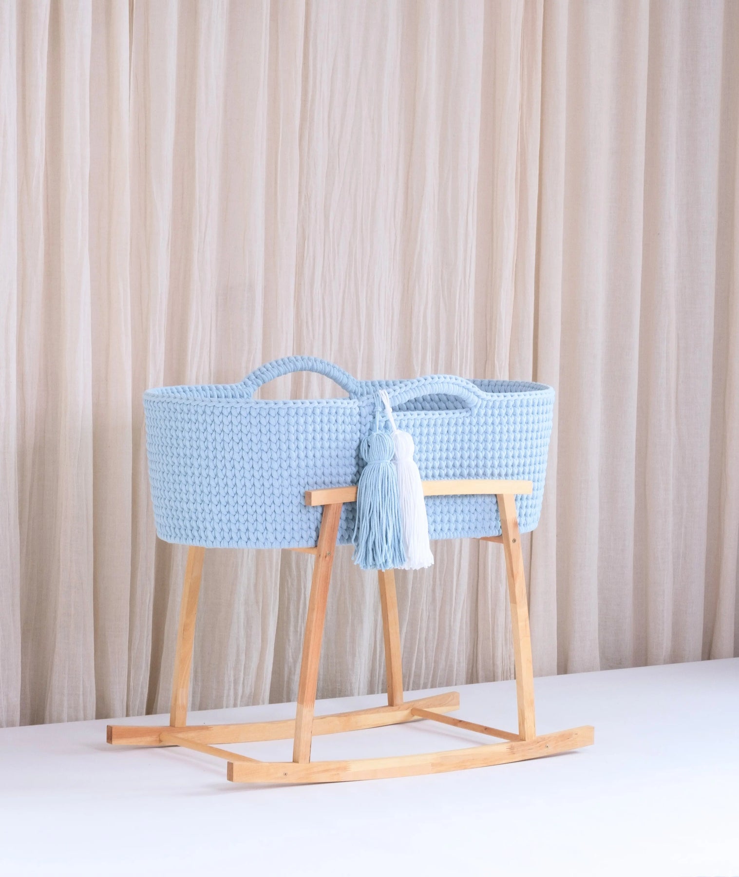 This Moses Basket can be personalized by choosing two of the tassels.