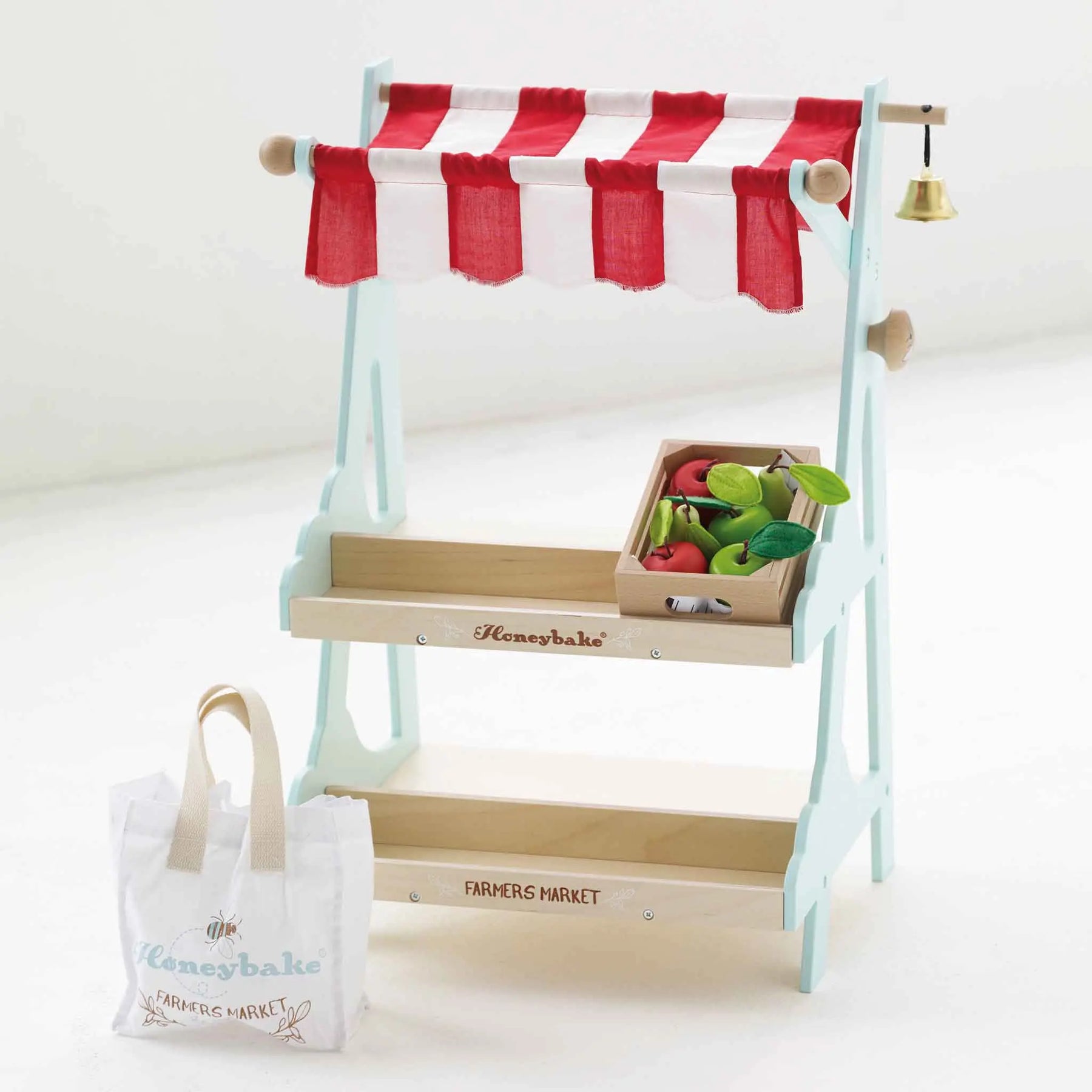 Featuring a fabric shopping bag, apples, a pears crate, and a bell for customers to ring for attention.