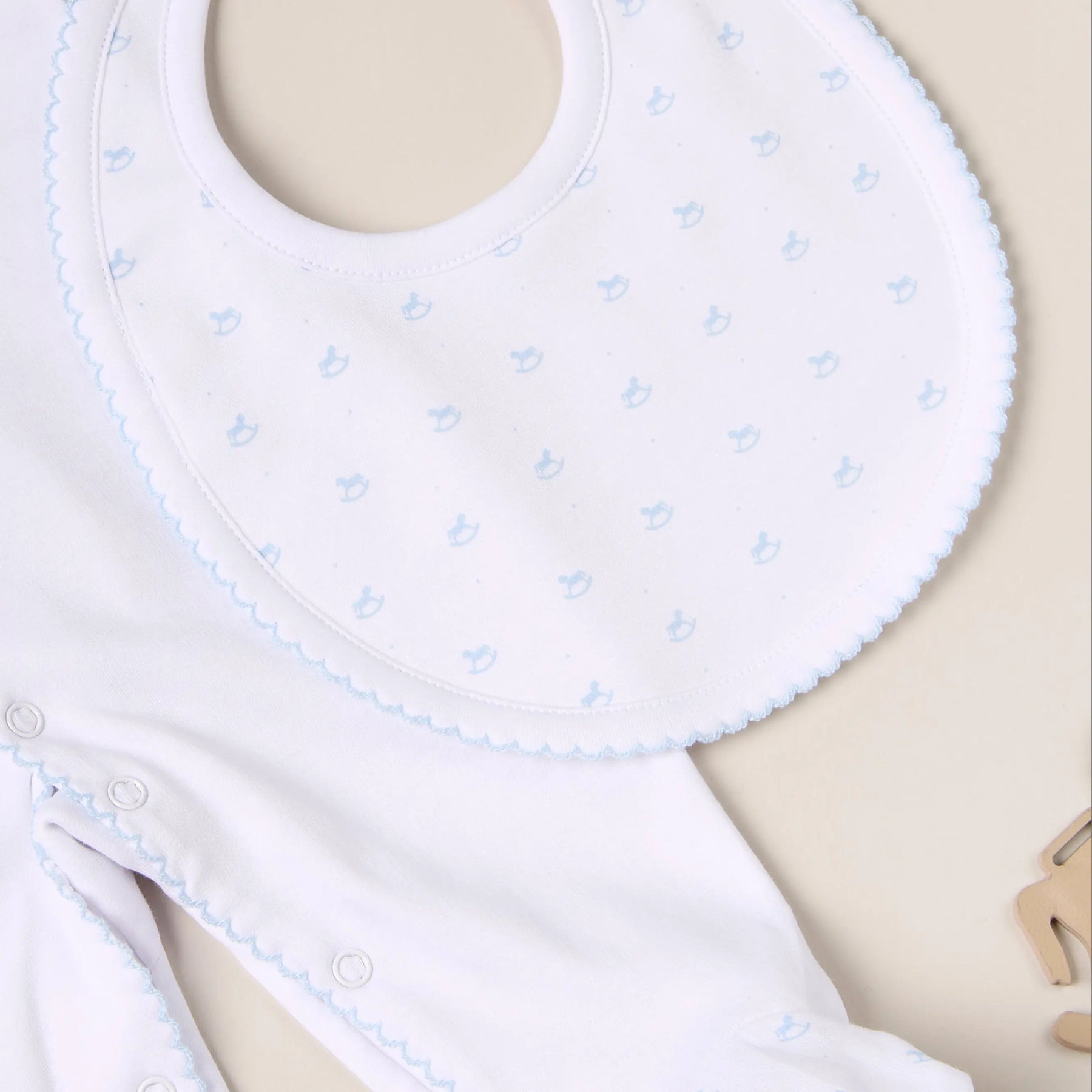 This charming baby boys bib, designed in collaboration with Lyda Baby, features an exclusive Blue Almonds rocking horse print in soft blue with matching trim....