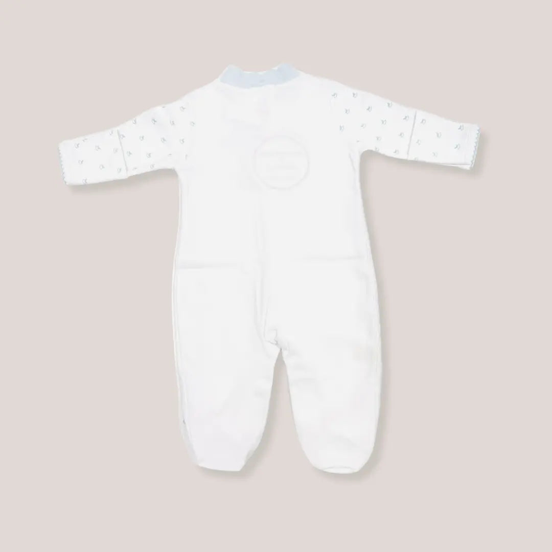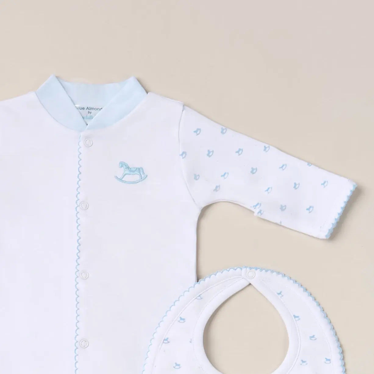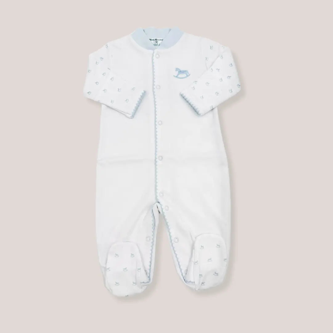 Dress your little boy in this charming babygrow, created with Lyda Baby. Made from premium Pima cotton, it’s beautifully soft and gentle on newborn skin. Featuring exclusive Blue Almonds rocking horse embroidery on the front, with playful soft blue rocking horse print on the arms and feet, all finished with matching trim. Easy popper fastening ensures quick changes.