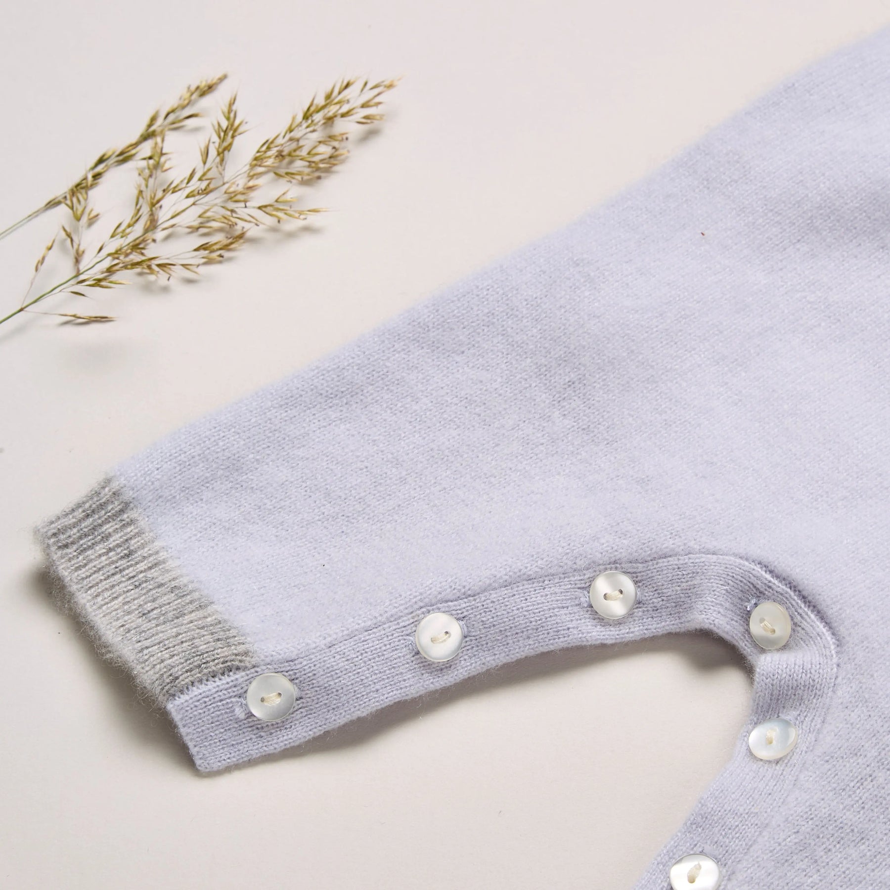The cashmere set is complemented with a beautifully coordinating long sleeved body suit from renowned Swiss brand Frilo, featuring a delicately embroidered collar for an added touch of charm.