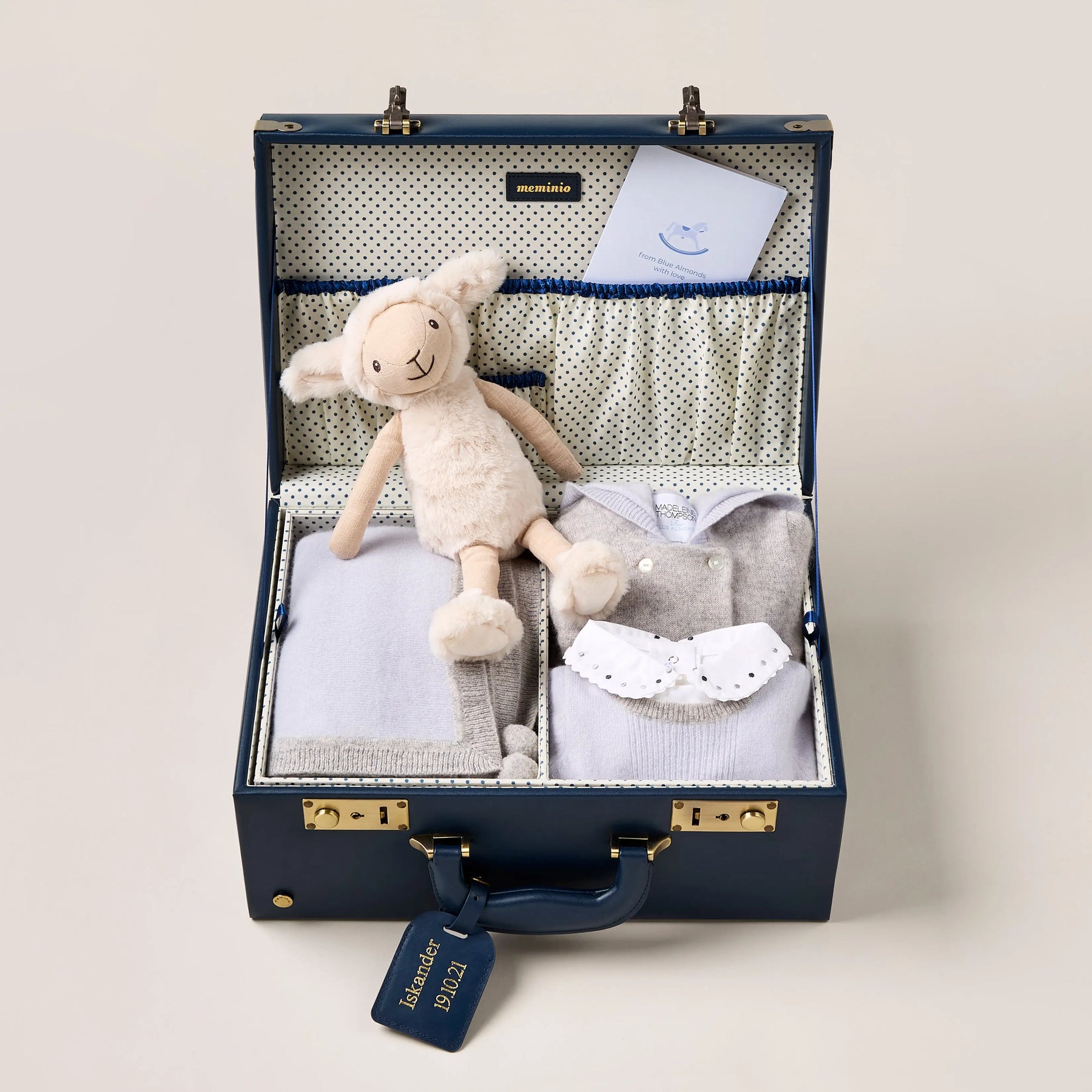 Everything is presented in a beautifully crafted meminio leather keepsake case, designed to hold treasured memories from baby’s earliest days—like scan pictures, hospital tags and first mementoes. The gold-embossed, personalised luggage tag adds a final, unforgettable touch.