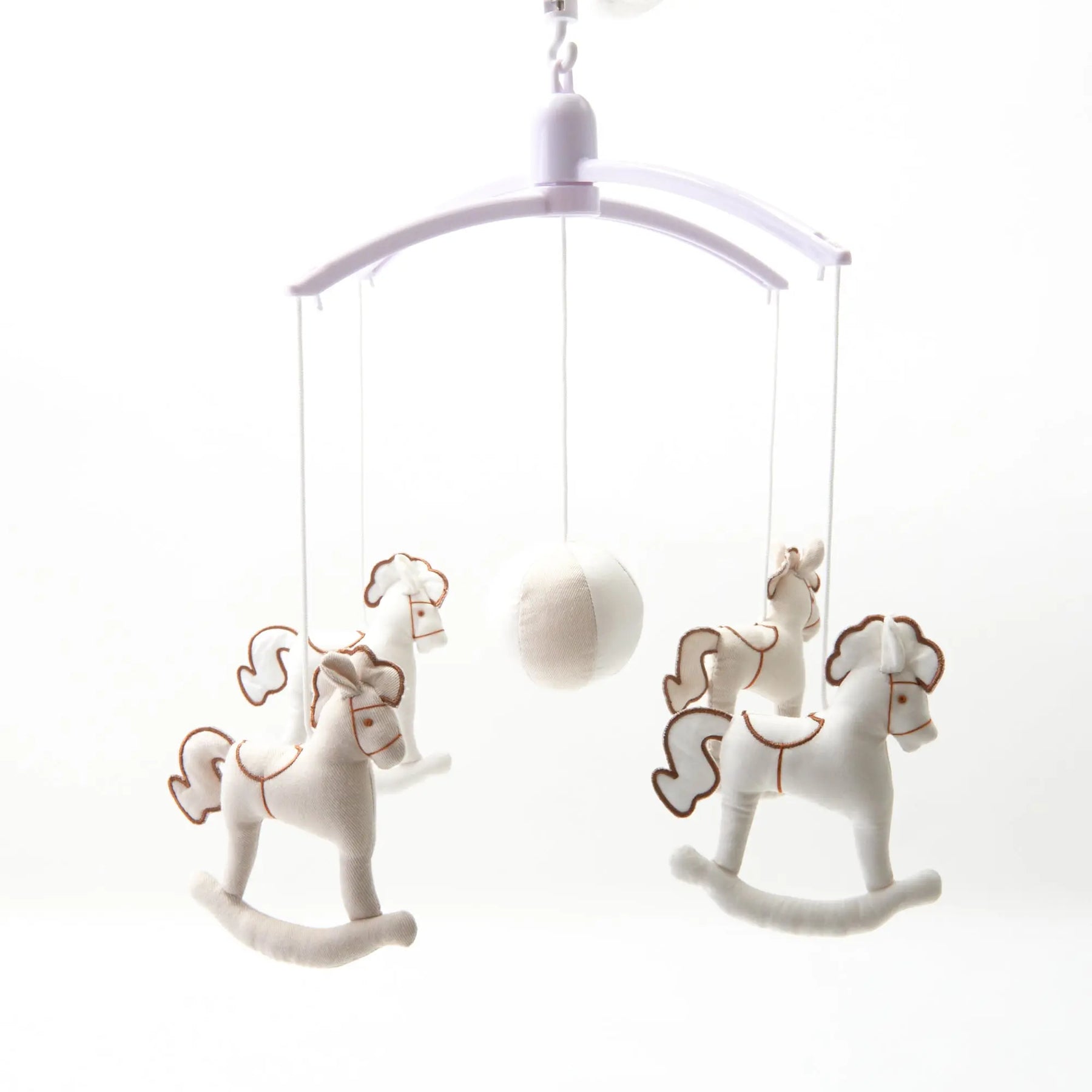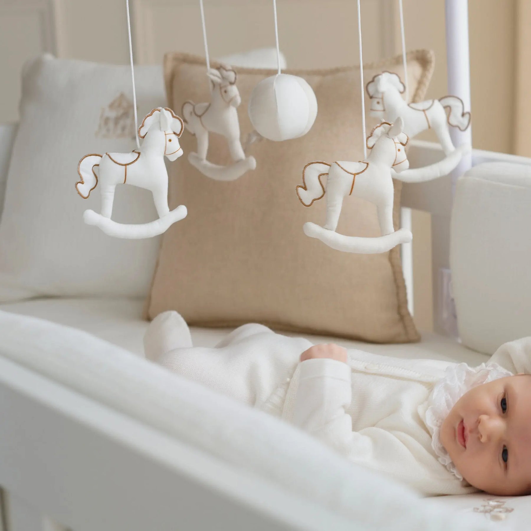 Carrousel style musical mobile featuring beautifully nostalgic carrousel horses. Will help infant fall asleep, thanks to a soft melody (Mozart’s Lullaby).