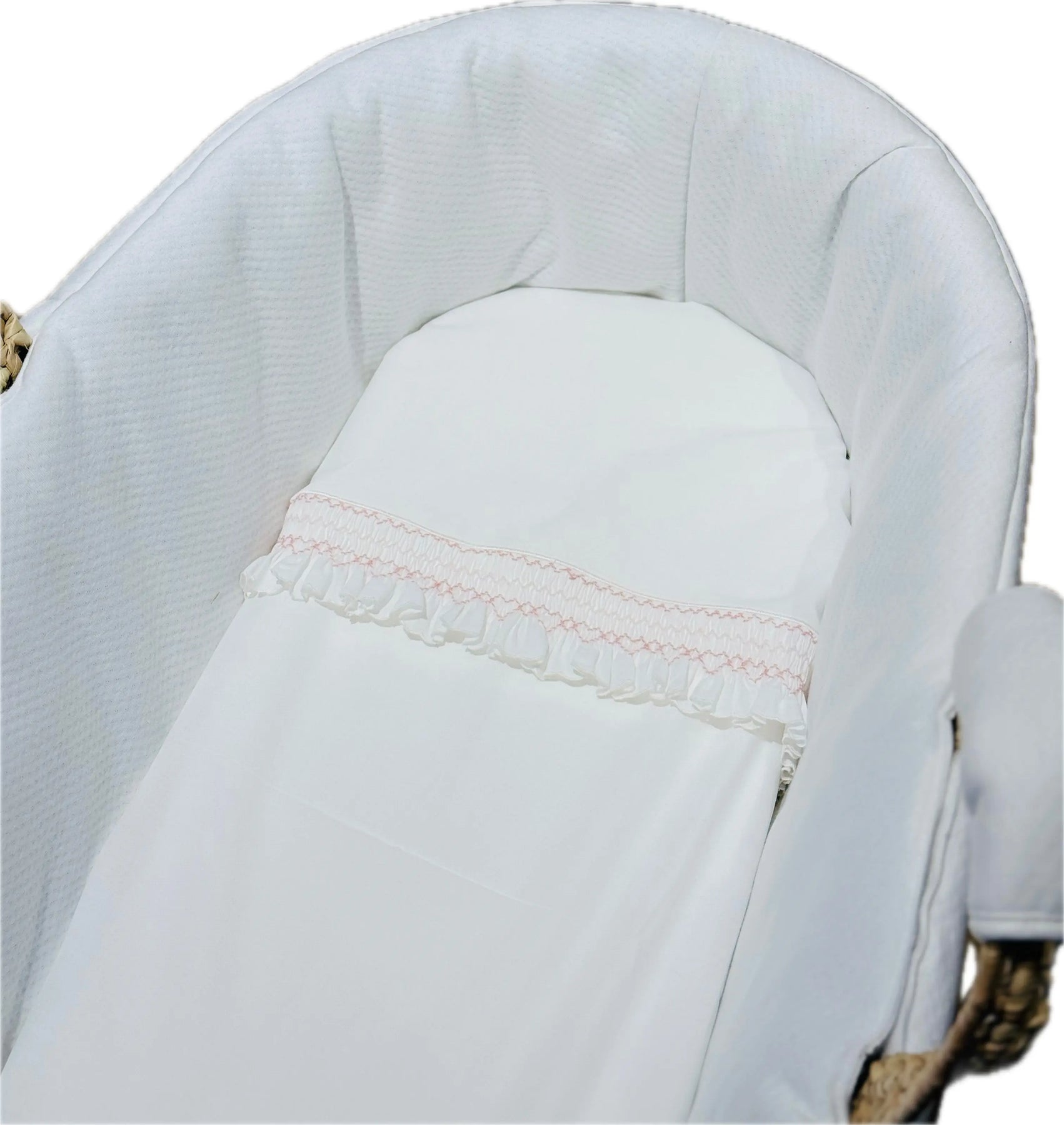 Adorable baby girls moses basket sheet set in white with delicate heart and flowers detail. The Amore baby sheet set is lovingly designed and handmade in Sicily using the finest materials.