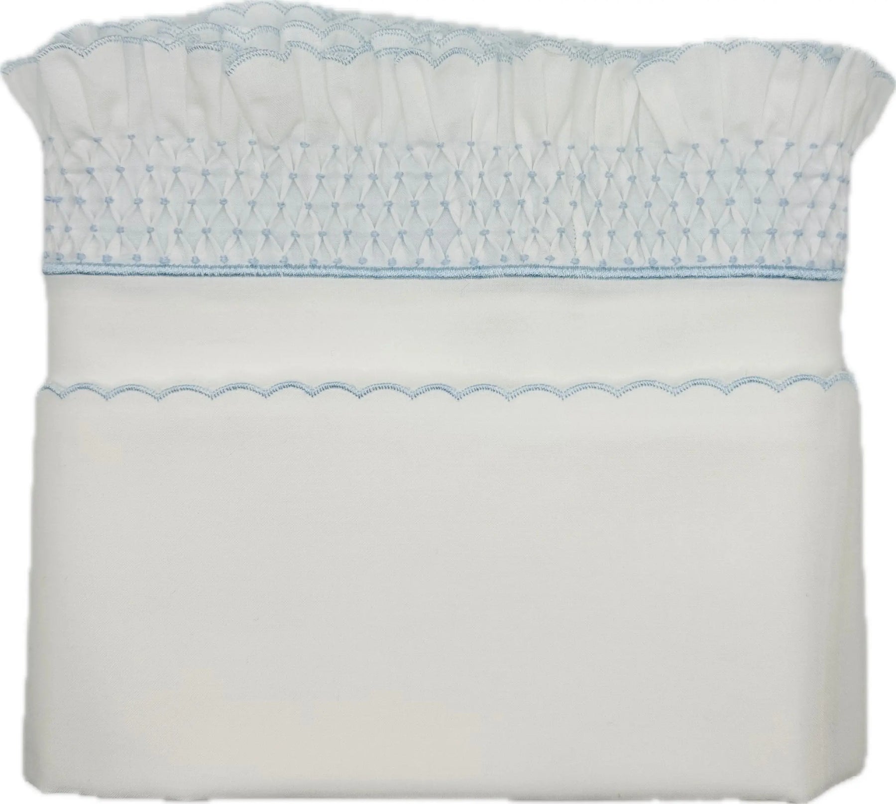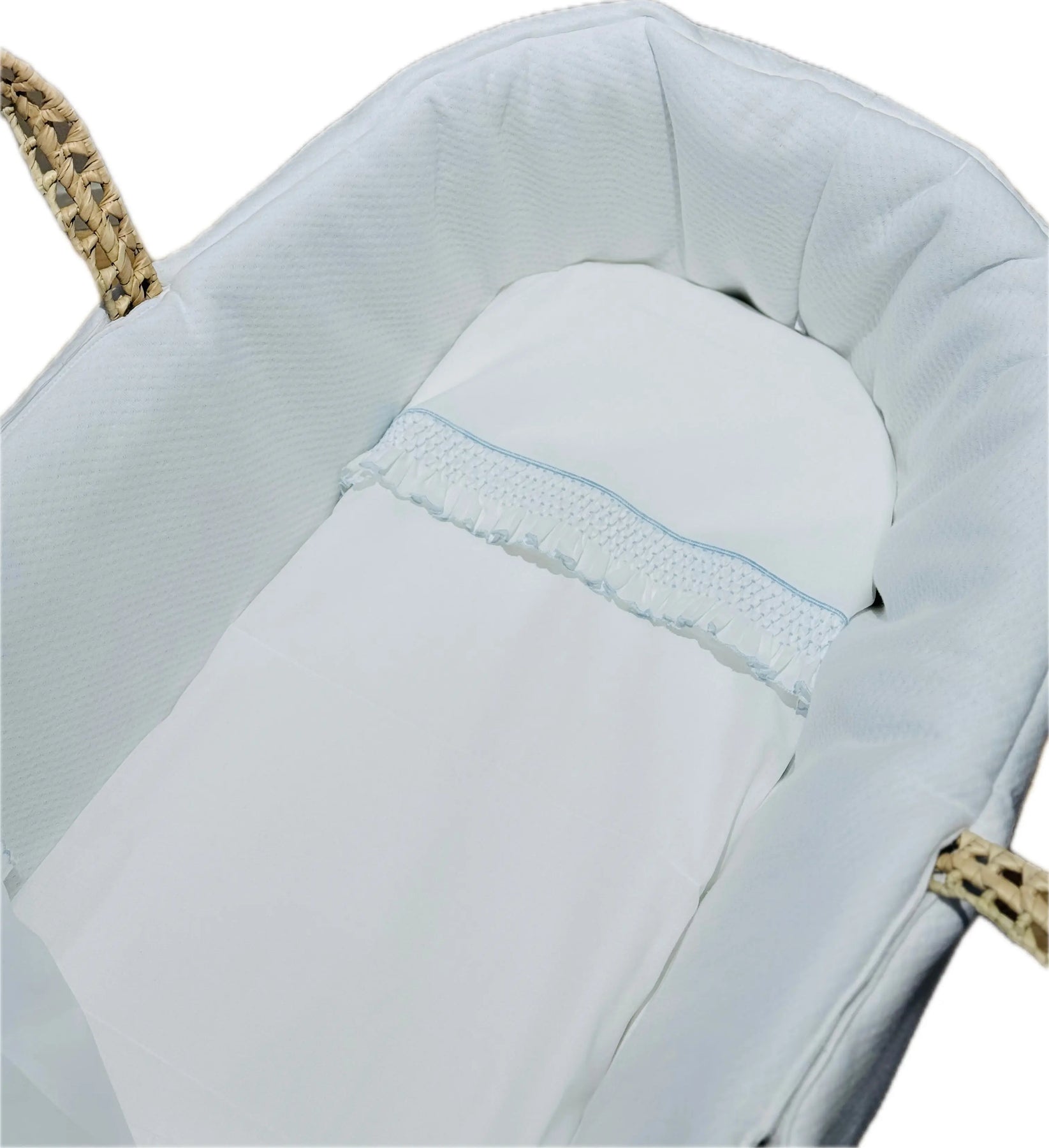 Exquisite baby boys moses basket sheet set in white with blue edging and delicate smocking detail. The Mio Caro baby sheet set is lovingly designed and handmade in Sicily using the finest materials.
