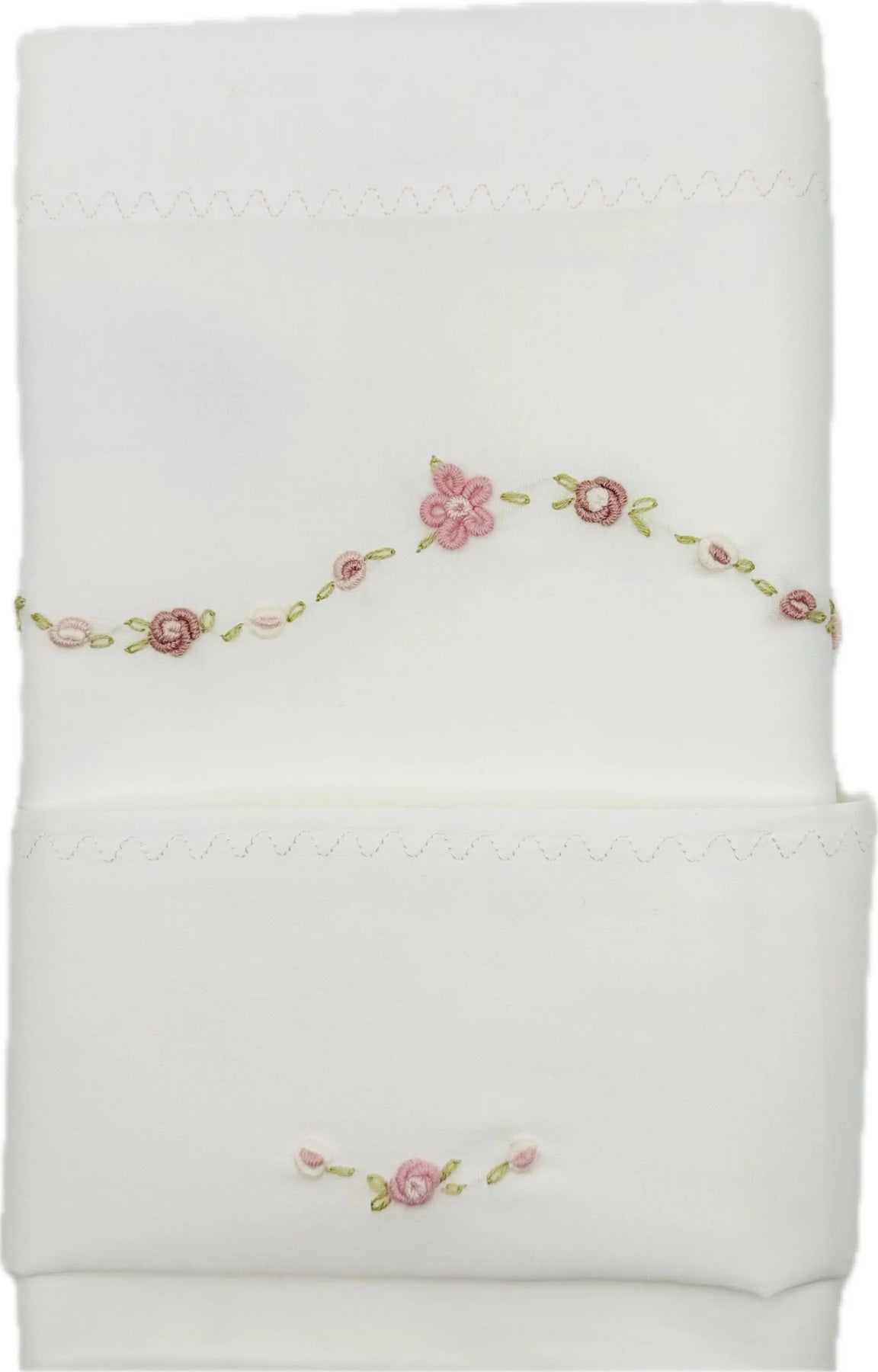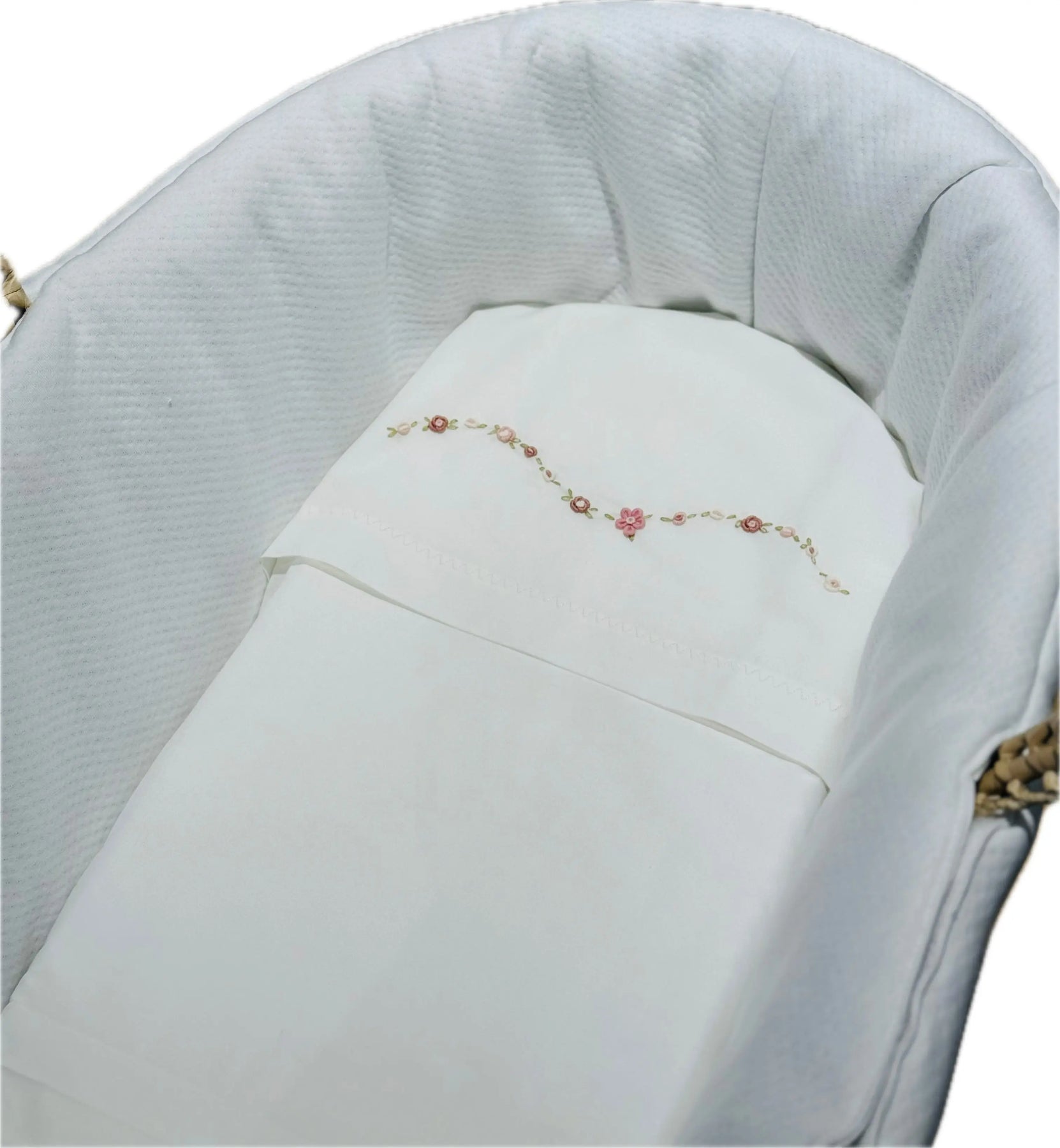 Exquisite baby girls moses basket sheet set in white with intricate pink little roses detail. The Piccola Rosa baby sheet set is lovingly designed and handmade in Sicily using the finest materials.