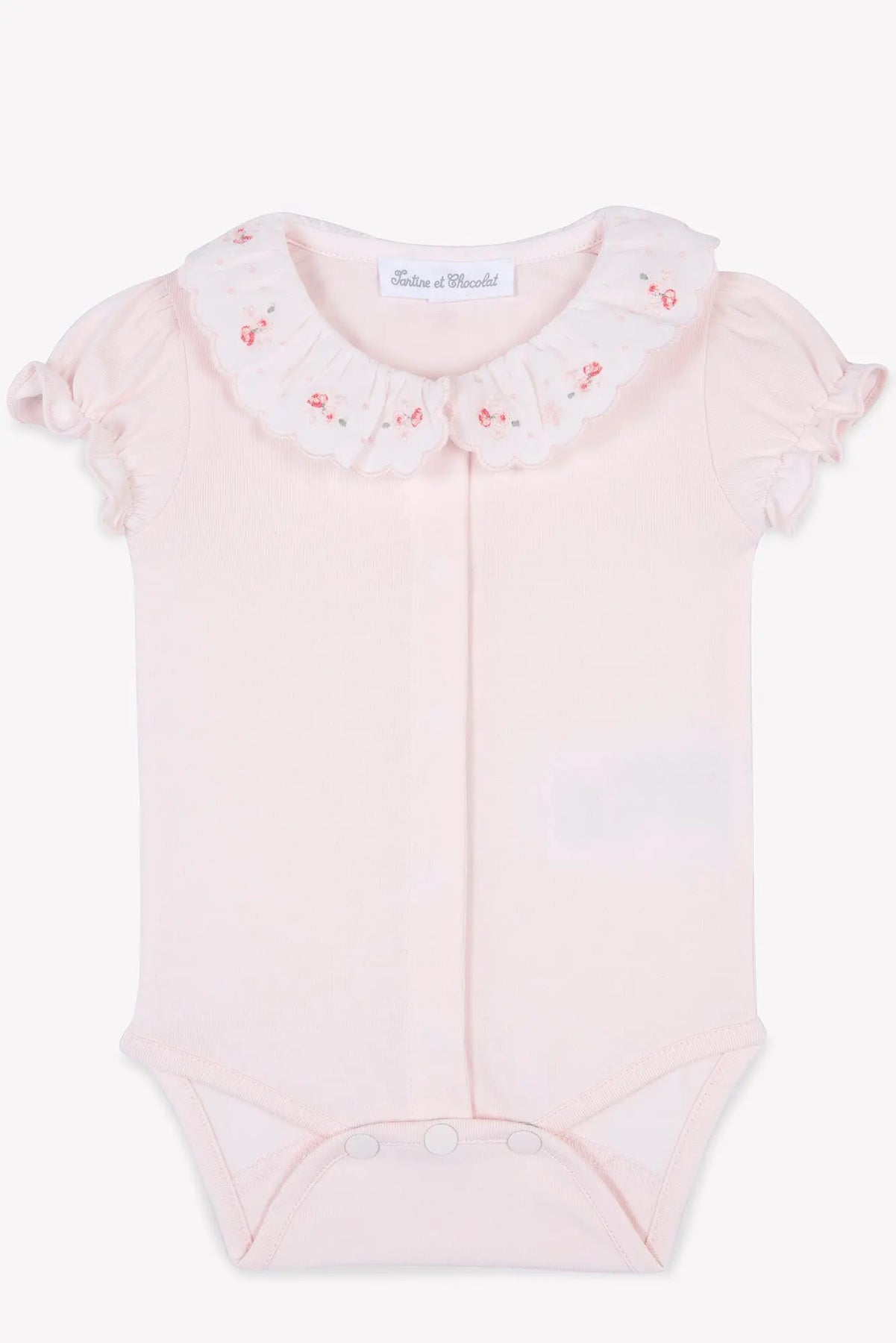 Dress your little one in this adorable Baby Girls Floral Pink Blouse & Leggings Set. The soft pink body suit features a frilled collar with delicate floral embroidery, perfectly paired with matching leggings. A beautiful outfit that will keep your baby girl comfortable and stylish.