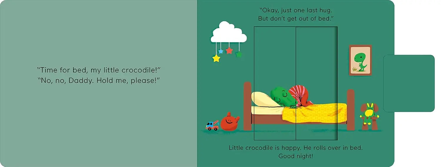 It's bedtime, but five animal friends just can't seem to fall asleep. Little Crocodile wants one last hug, Little Monkey feels it's too dark, and Little Cat just wants to play some more. With patience and understanding, their moms and dads know just how to soothe their children, and provide the comfort that eventually sends them off to sleep. Young children will enjoy pulling the tabs to change the pictures on every spread, to see just how the little animals are reassured. A timely and important addition to preschool books about growing up.