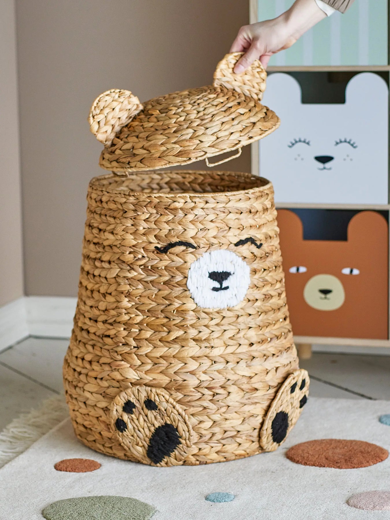 The Timone Basket with Lid by Bloomingville MINI is ideal for storage while also being a fun playmate. The large bear basket keeps track of all the toys and adds a cosy touch to any room. The basket's lid can be removed, making it easy for little hands to access teddy bears and toys and to tuck them away again. The basket's appearance may vary depending on the season the material is harvested in.